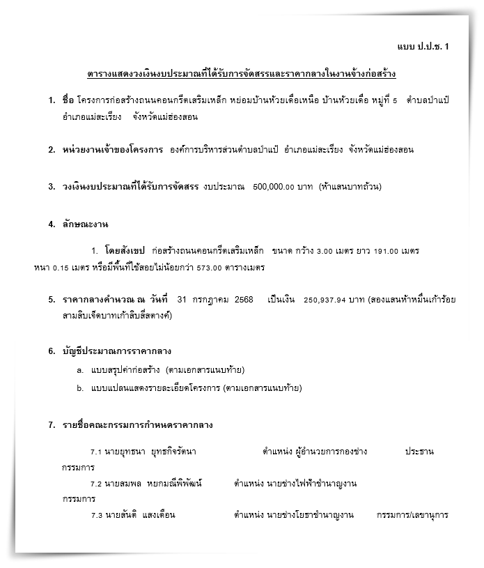 การจัดสรรและราคากลาง การก่อสร้างถนนคอนกรีตเสริมเหล็กบ้านห้วยเดื่อ หมู่ที่ 5 บ้านห้วยเดื่อ
