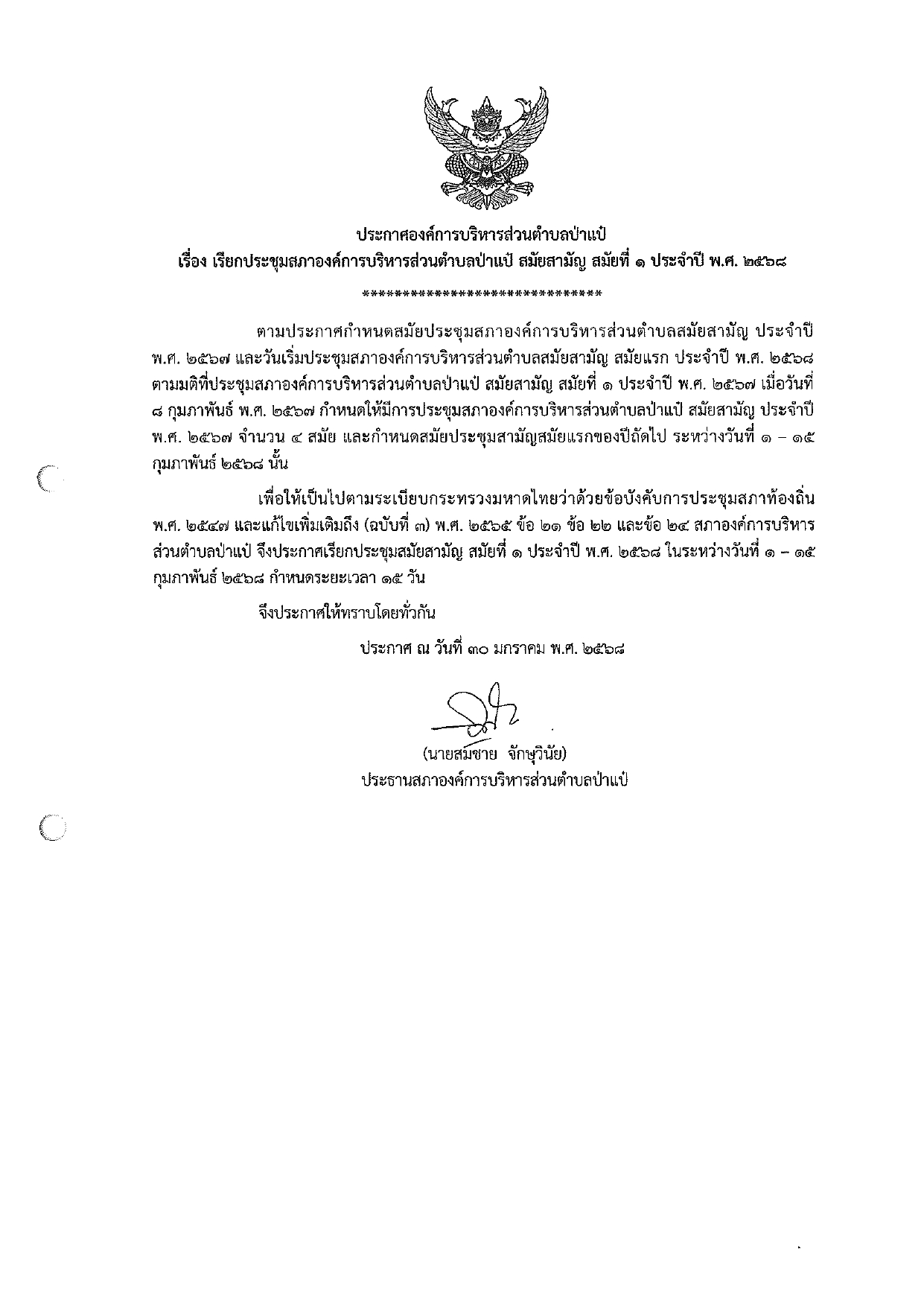 ประกาศองค์การบริหารส่วนตำบลป่าแป๋ เรื่อง เรียกประชุมสภาองค์การบริหารส่วนตำบลป่าแป๋ สมัยสามัญ สมัยที่ ๑ ประจำปี พ.ศ. ๒๕๖๘