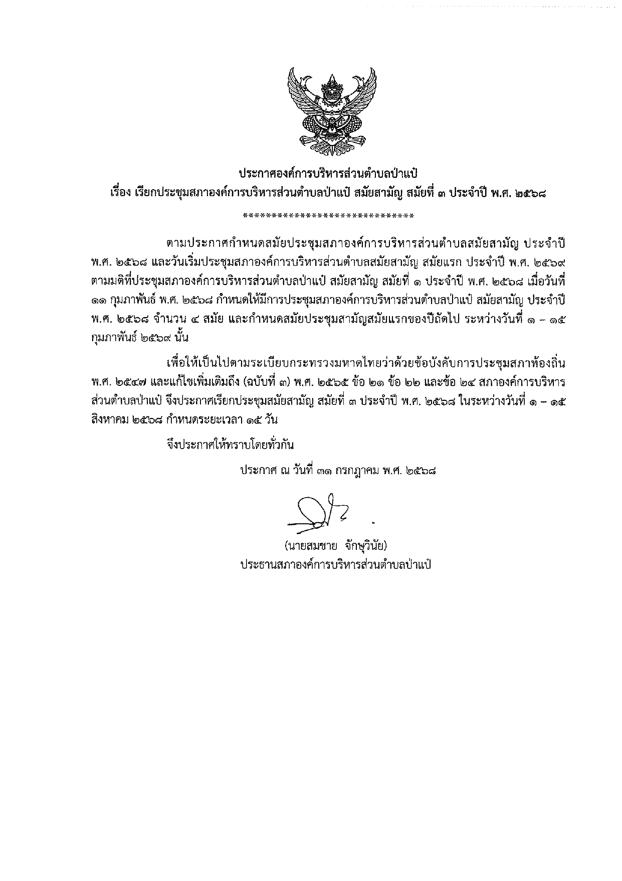 ประกาศองค์การบริหารส่วนตำบลป่าแป๋ เรื่อง เรียกประชุมสภาองค์การบริหารส่วนตำบลป่าแป๋ สมัยสามัญ สมัยที่ ๓ ประจำปี พ.ศ. ๒๕๖๘