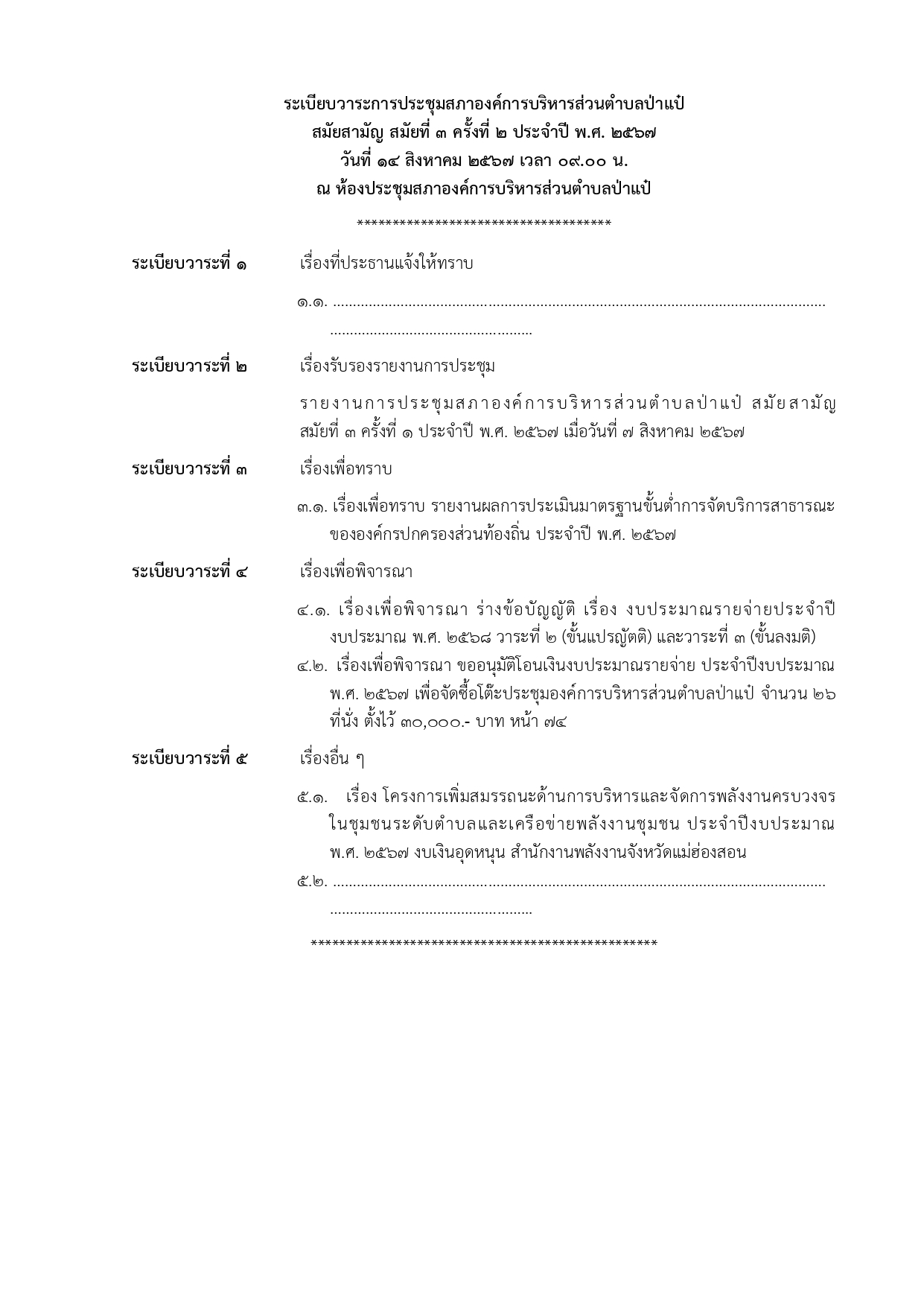 รายงานการประชุมสภาองค์การบริหารส่วนตำบลป่าแป๋ สมัยสามัญ สมัยที่ ๓ ครั้งที่ ๒ ประจำปี พ.ศ. ๒๕๖๗