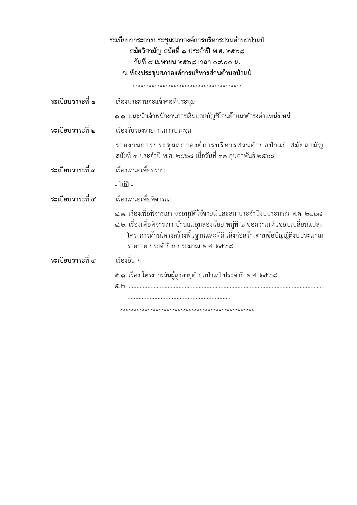 รายงานการประชุมสภาองค์การบริหารส่วนตำบลป่าแป๋ สมัยวิสามัญ สมัยที่ ๑ ประจำปี พ.ศ. ๒๕๖๘