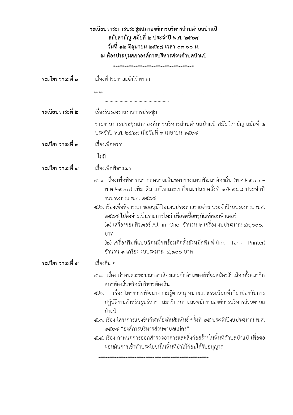 รายงานการประชุมสภาองค์การบริหารส่วนตำบลป่าแป๋ สมัยสามัญ สมัยที่ ๒ ประจำปี พ.ศ. ๒๕๖๘