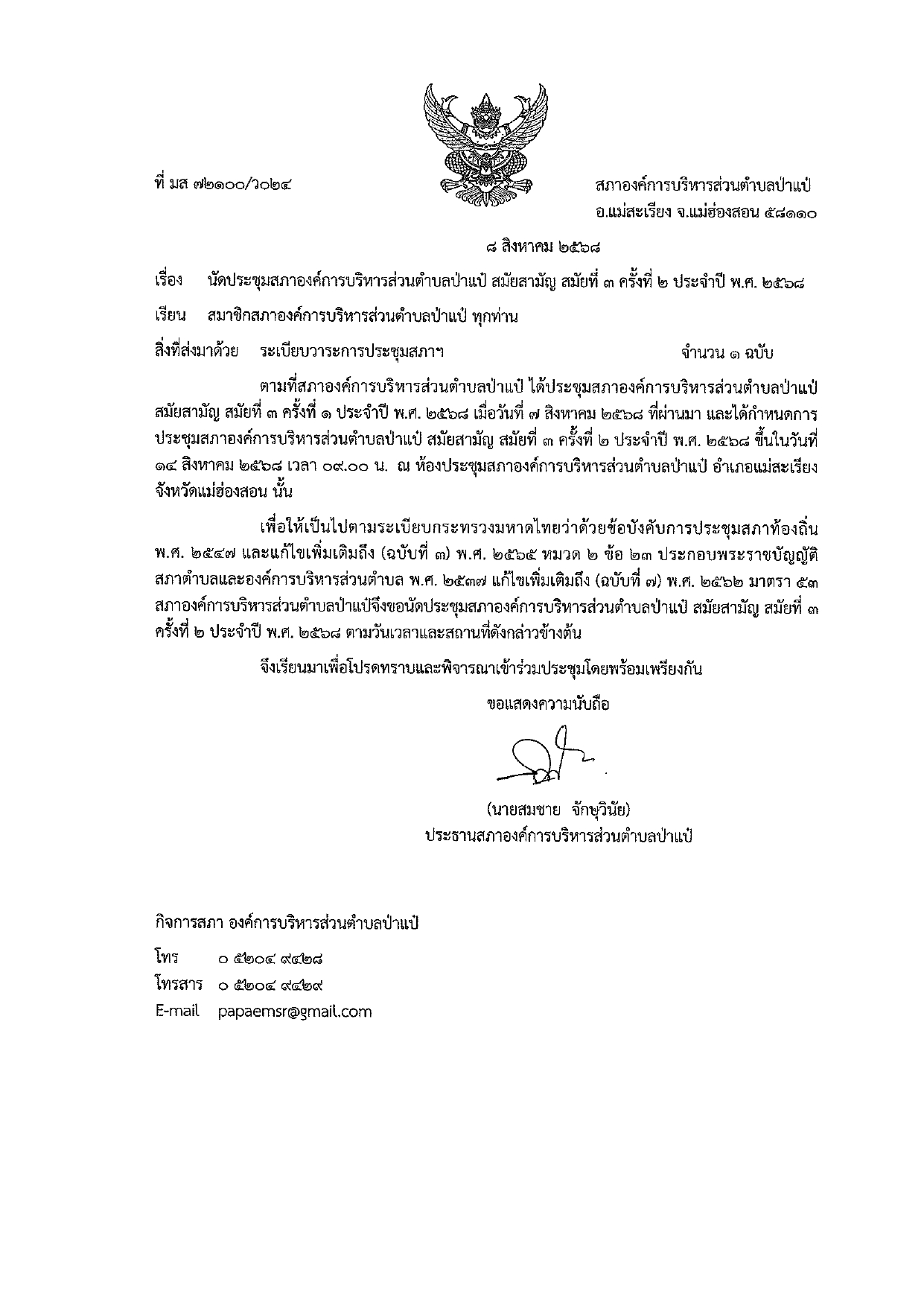 นัดประชุมสภาองค์การบริหารส่วนตำบลป่าแป๋ สมัยสามัญ สมัยที่ ๓ ครั้งที่ ๒ ประจำปี พ.ศ. ๒๕๖๘